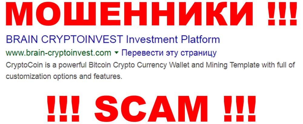 Брайн Криптоинвест - очередные мошенники сети интернет, которые занимаются разводом пользователей сети интернет под предлогом инвестиций в криптовалюту, в ходе которых шулера Brain Cryptoinvest нагло кидают свою клиентуру. В связи с этим иметь дело и сотрудничать с аферистами Брайн Криптоинвест определенно не рекомендуем !!!