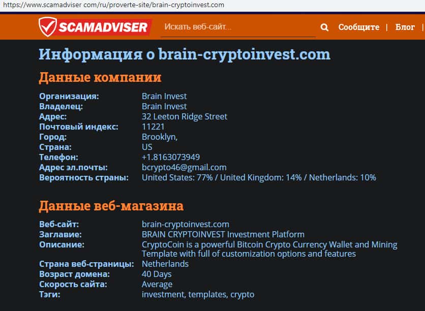 - Ввиду возраста аферистов Брайн Криптоинвест и отзывов о них в сети интернет нету