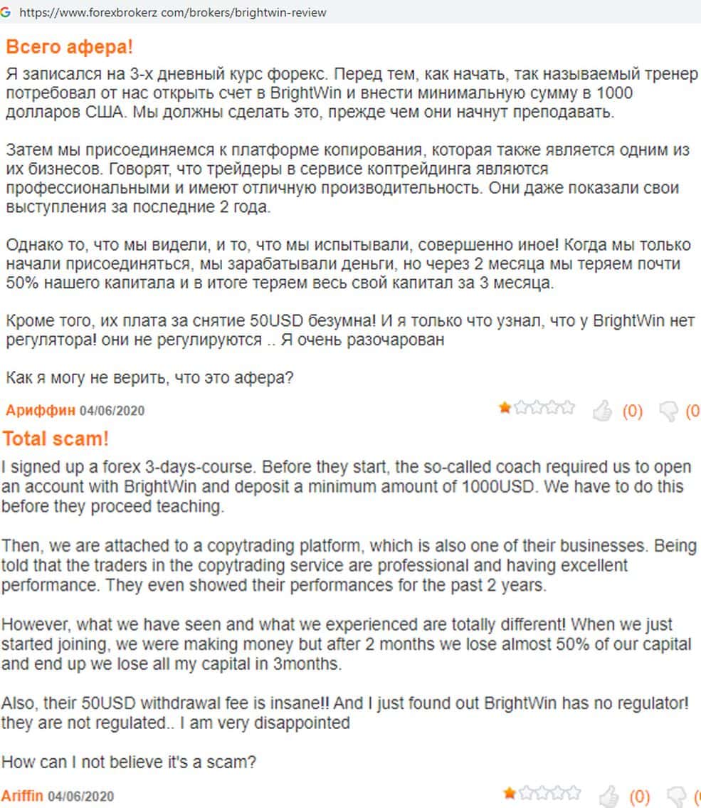 Поскольку репутация скам-конторы BrightWin оставляет желать лучшего, они ищут жертв через псевдо-обучающие центры. Так называемые тренеры принудительно заставляют учеников открывать счет у мошенников, а те, в свою очередь, имитируют торговлю на фиктивных платформах и крадут депозит, говорится на ресурсе forexbrokerz com .