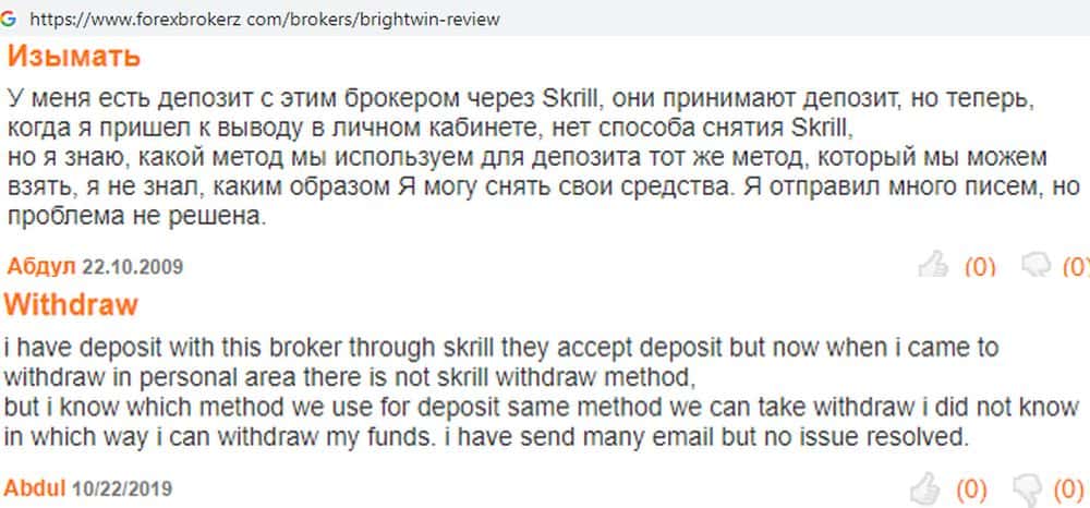На том же портале форексброкерз ком пострадавшие рассказывают, что вывести деньги со счетов пройдох Брайт Вин невозможно. Функция снятия средств у них просто не предусмотрена, так что трейдеры, пополнившие депозит, попадают в ловушку. Вне зависимости от того, насколько успешно идет торговля, прибыль достается мошенникам.