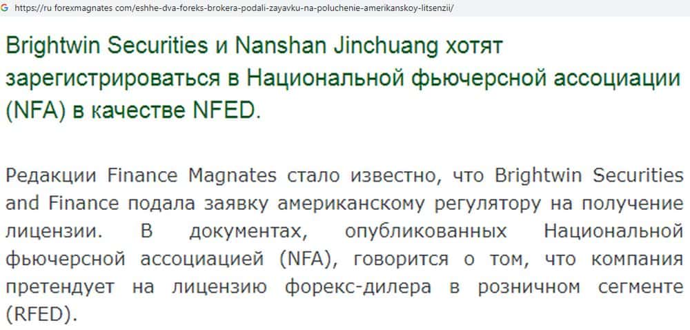 Как стало известно онлайн-изданию ru forexmagnates com, аферисты Брайт Вин пытаются подняться на новый уровень и заполучить лицензию Национальной фьючерсной ассоциации в США. Этот документ позволит им называться солидным брокером, выйти на новые рынки и увеличит доверие со стороны трейдеров, а значит, и поток потенциальных жертв.