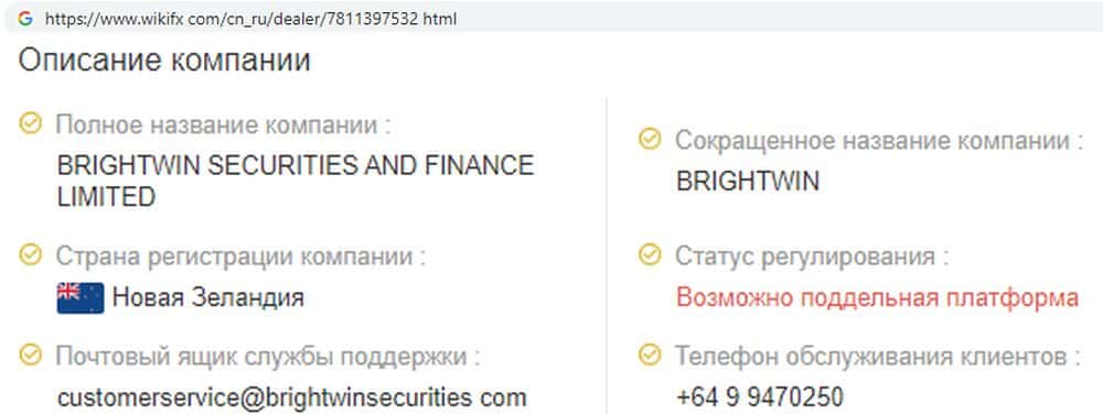 Портал викиэфикс ком предупреждает своих пользователей держаться как можно дальше от шарашкиной конторы BrightWin. Хотя форекс-мошенники и утверждают, что у них есть лицензия, это не значит, что активы трейдеров в безопасности. Во-первых, хапуги могут просто копировать чужие данные или купить лицензию у сомнительного регулятора.
