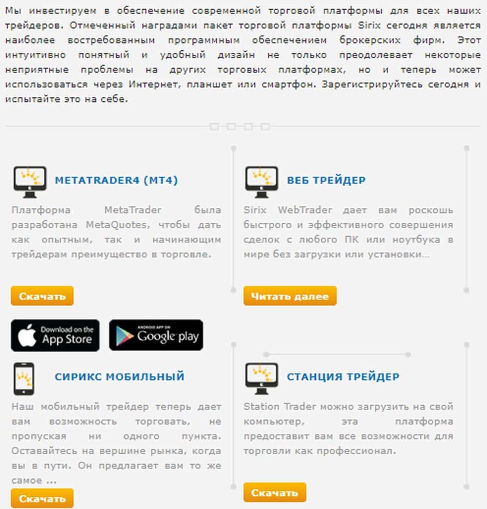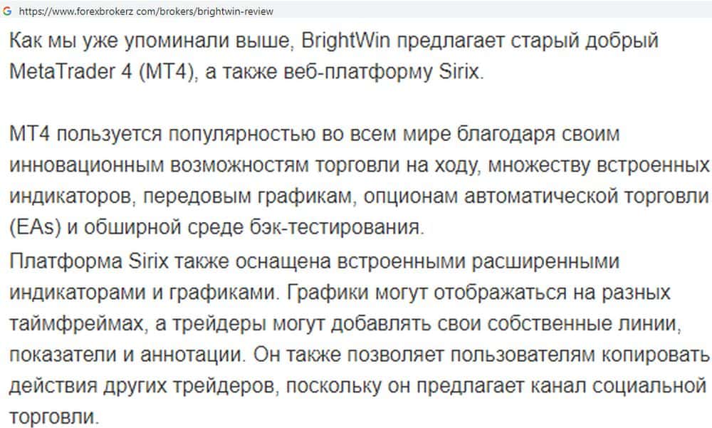 Финансовые онлайн-мошенники BrightWin утверждают, что у них есть преимущества перед другими брокерами. Именно так они заманивают новичков. Среди этих преимуществ - целых две платформы на выбор, MT4 и Sirix. Вторая якобы оснащена встроенными расширенными индикаторами и графиками и позволяет копировать действия других трейдеров.