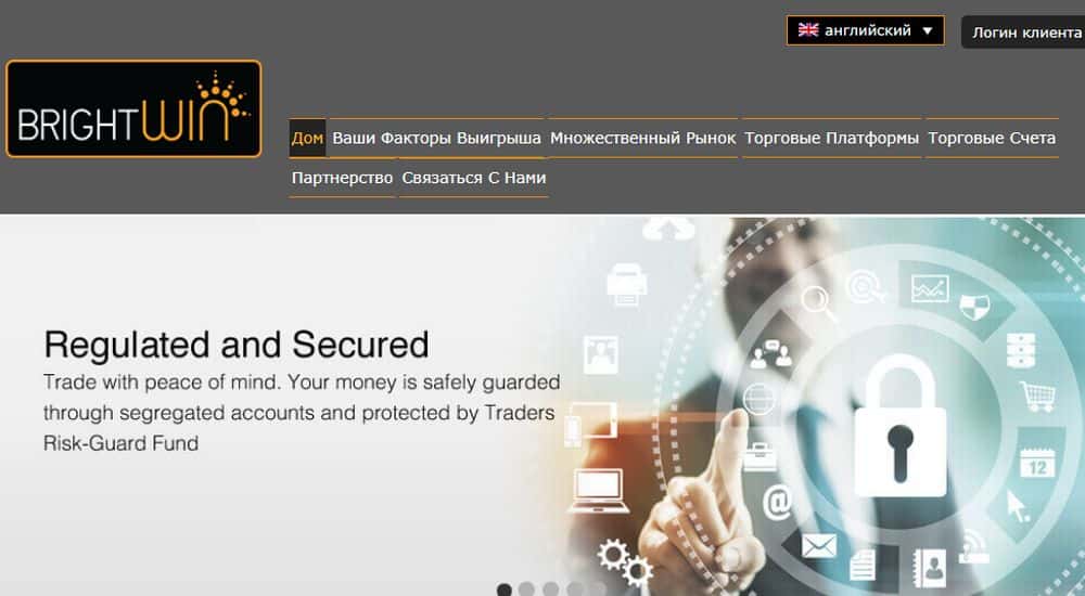 Форекс-проходимцы BrightWin создали посредственный ресурс для заманивания неосторожных трейдеров. Сайт в черно-оранжевых цветах, доступен на английском, вьетнамском и китайском. На морде - картинка с замком и лживый лозунг "регулируемый и защищенный", который должен убедить новичков, что их деньги будут в безопасности.