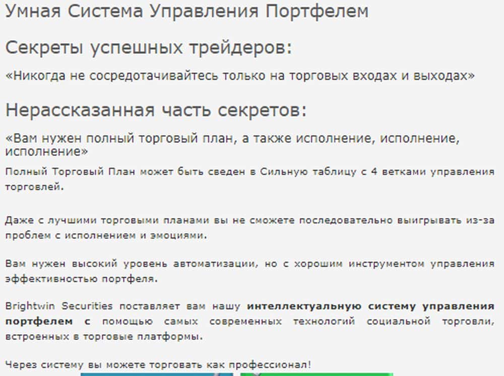 Одни из "фишек" липового брокера Брайт Вин - так называемая умная система управления торгами. Видимо, речь идет об обычных ботах, сливающих депозиты мошенникам в карман. Но расписано все так, что это едва ли не самая совершенная система, которая торгует лучше профессиональных трейдеров, поэтому зарабатывать миллионы могут даже новички.