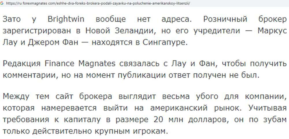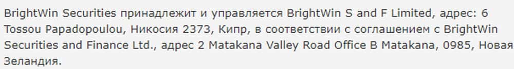 В разделе "условия и положения" на сайте катал BrightWin указано, что Brightwin Securities And Finance Limited принадлежит и управляется некой конторой BrightWin S and F Limited, которая, как оказалось, сидит в оффшоре. При этом материнская контора просто зарегистрирована как предприятие, но не имеет разрешения на финансовую деятельность.