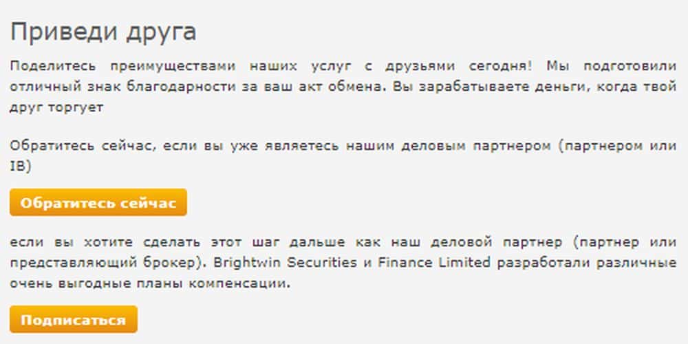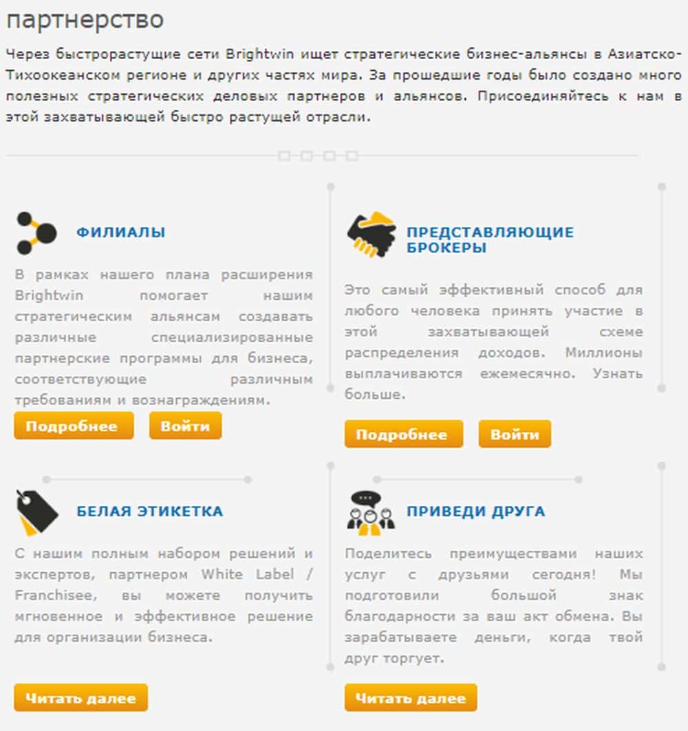 В рамках партнерской программы махинаторы Брайт Вин предлагают открывать филиалы всем желающим попробовать себя в грязном бизнесе, обеспечивая им оффшорное прикрытие и псевдо-регуляцию - так называемое мгновенное решение для бизнеса. Можно стать представляющим брокером или просто приводить в лохотрон друзей и получать за это мзду.