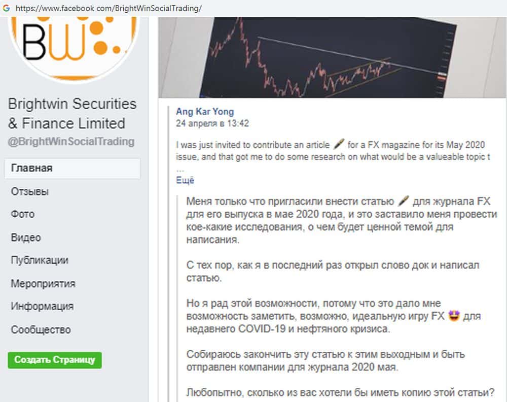 Лохотронщики BrightWin не очень активны в соцсетях, удалось обнаружить только профиль на Фейсбук, зато довольно популярный - клюнуло на него уже больше 1000 человек. Вероятно, их привлекли статьи псевдо-аналитического характера. В последней, например, мошенники утверждают, что поняли, как преодолеть биржевой кризис, вызванный пандемией.