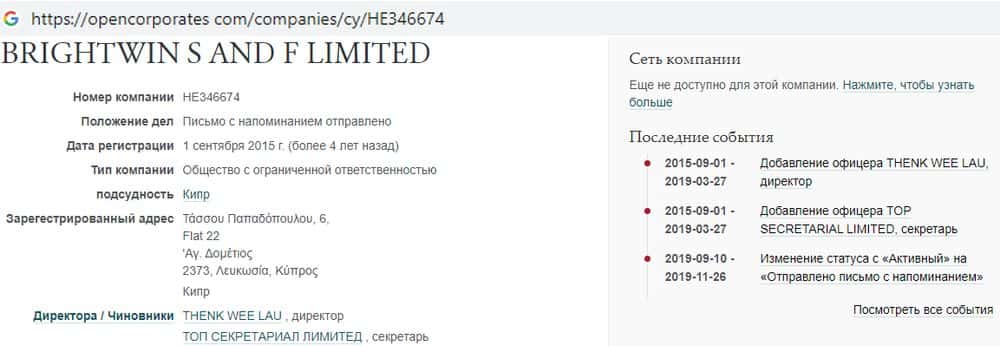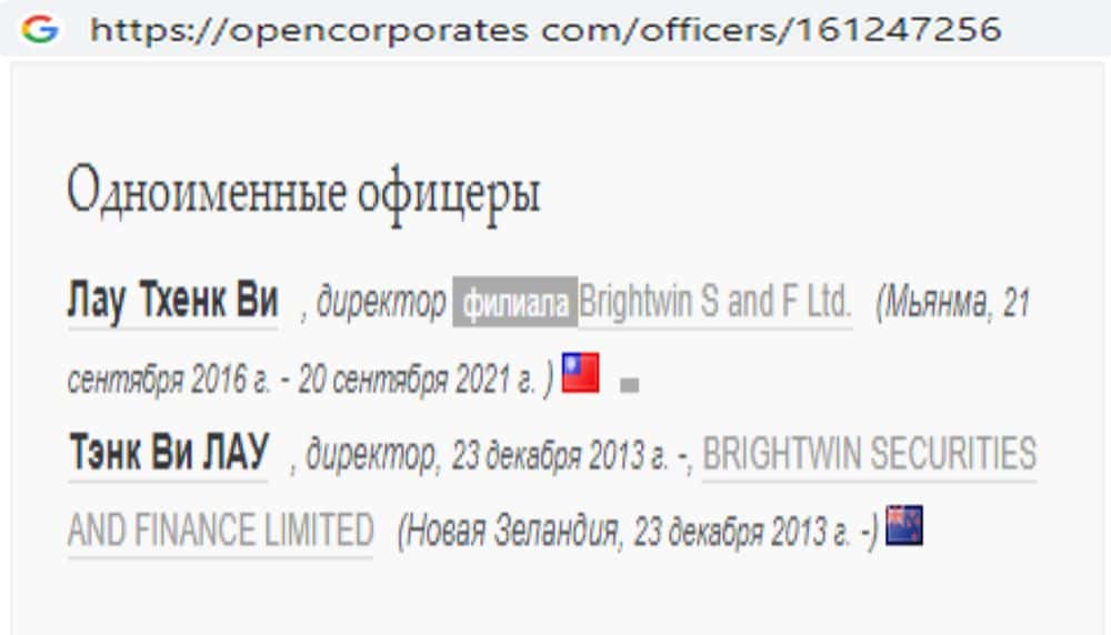 В официальных данных, предоставленных регуляторами, вообще ни один из вышеуказанных соучредителей не фигурирует. Здесь управленческую функцию выполняет какая-то сторонняя кипрская контора под названием Top Secretarial Limited, появляется филиал в Мьянме, а директорами указаны другие люди. Руководство мошенников BrightWin:
