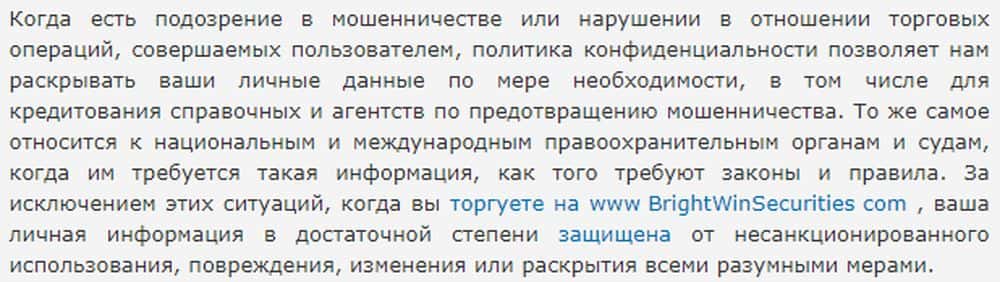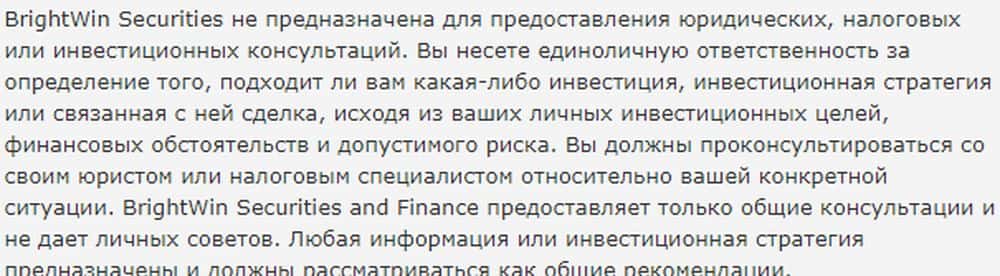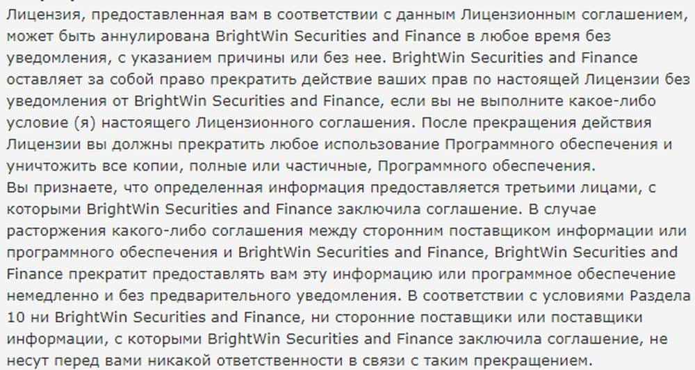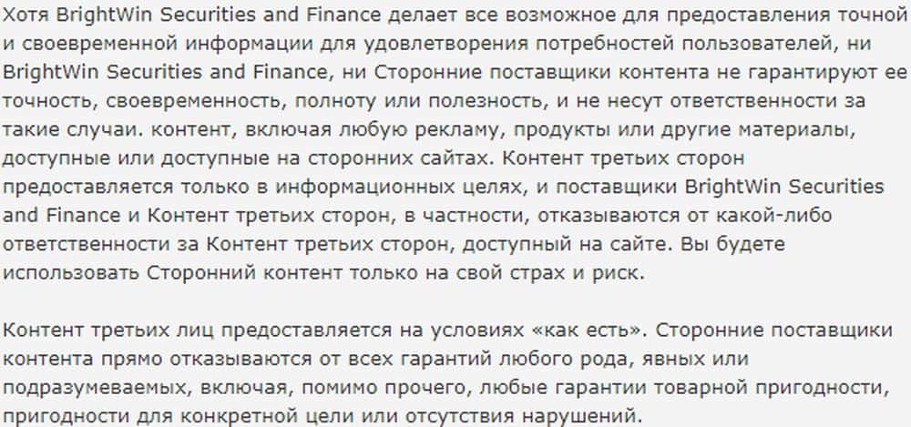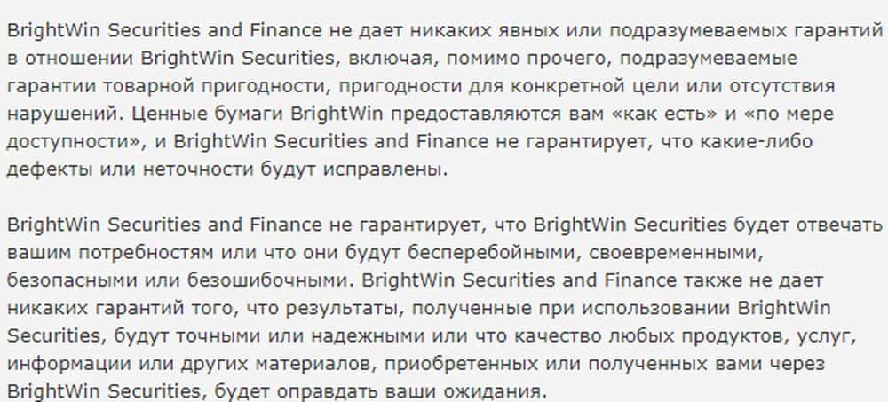 Более того, жулики Брайт Вин заявляют, что не гарантируют, что их продукты (акции, платформы и так далее) вообще будут пригодны для каких-то целей трейдеров. В этой корявой формулировке завуалировано сообщение, что если вы пополнили депозит мошенникам Брайт Вин с целью получения какой-то выгоды, можете просто об этом забыть.