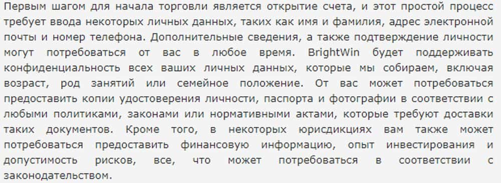 В любой момент аферисты Брайт Вин могут потребовать от жертв больше личной информации: налоговый номер, скан паспорта, банковские выписки, справку о семейном положении и другие. Защищать их вроде обещают, но могут и раскрыть в рамках борьбы с мошенничеством и отмыванием денег - то есть, кому и когда захотят.