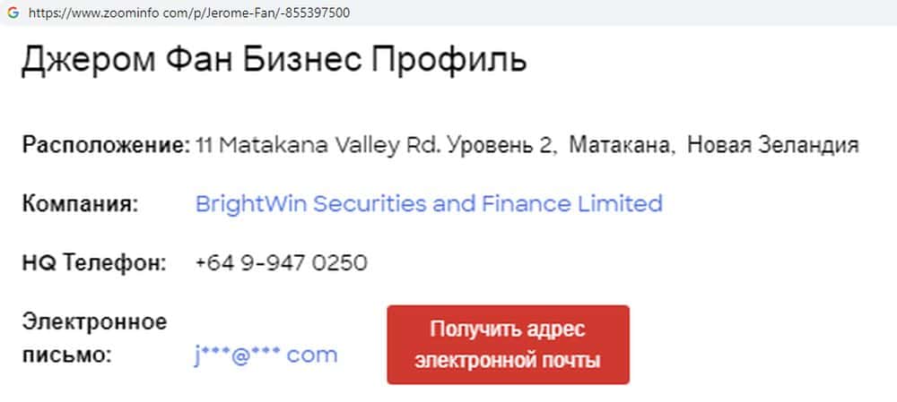 Лохотронщики BrightWin делают все возможное, чтобы поддерживать репутацию солидного брокера. Получается не очень убедительно. Офис в Новой Зеландии, как и лицензия, являются просто пустышками, филиалом-прикрытием. На самом деле конторка сидит в оффшоре по адресу 6 Tossou Papadopoulou, Никосия 2373, на Кипре, а ее руководство - в Гонконге.