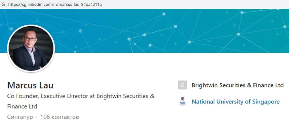 На сайте форекс-мошенников Брайт Вин нет информации о руководителях или команде. Но ее легко можно раздобыть на сторонних ресурсах. Например, в популярной социальной сети ЛинкедИн есть профиль некого соучредителя и исполнительного директора, который находится в Сингапуре, что странно.