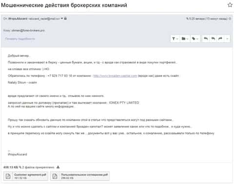 Броаден Капитал занимается посреднической деятельностью между жертвами обмана и ION-EX. Контора звонит своим клиентам и предлагает вложить деньги в ценные бумаги, акции, то есть портфельные инвестиции, даже обусловливая это тем, что все вклады застрахованы. Так случилось и с одним человеком, которому позвонили с номера +79297178316 и начали втирать эту информацию. Также звонили со скайпа под именем Nataly Stoun. Клиент вроде и согласился на условия, но тут попросил ознакомится с договором и оказывается здесь фигурирует форекс-кухня ИОН ЕХ. И тут все стало понятно ION-EX прикрывается Броаден Капитал и от ее имени завлекает новых клиентов и обманывает их на деньги. Броаден Капитал не очень известный брокер, а вот ИОН ЕХ довольно много накосячил на протяжении своей деятельности и можно смело заявить, что они мошенники.