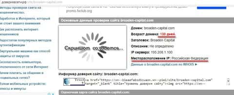 Аферисты брокерской конторы Броаден Капитал продолжают обманывать наивных и недалеких клиентов. Но если человек более осторожный, то он проверит для начала что это за фонд. Так вот согласно информационному ресурсу довериевсети рф сайт форекс-кухни Broaden Capital имеет возраст домена 130 дней, что не вписывается в концепцию хэдж-фонда с 10-летним стажем. Также в глаза бросается месторасположение IP-адреса в Российской Федерации, что не вяжется с расположением офисов компании. Так что лучше уберечь свои деньги от этих мошенников.