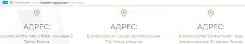 Контора Броаден Капитал решила запутать своих клиентов и разместила свои офисы в различных странах - это Эстония, Литва и Польша. Скорее всего это липовые адреса так как адрес сайта зарегистрирован в Российской Федерации, а иностранные сайты и знать не знали об этой кухне.