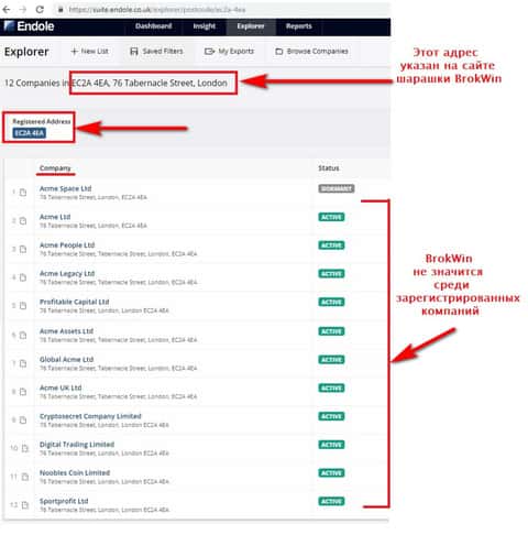По адресу, который есть на сайте шарашкиной конторы Брок Вин: 76 Tabernacle Street, London, United Kingdom, EC2A4EA, зарегистрированы совершенно другие фирмы. Сразу понятно, что мошенники создали сайт впопыхах, на заморачиваясь даже на то, чтобы представить более или менее правдоподобные сведения своим будущим жертвам.