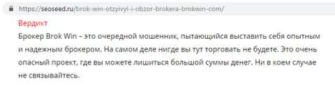 Так выглядит окончательное решение портала seoseed ru о дилинговой кухне Брок Вин. Не связываться с этим опасным проектом призывают знающие в трейдинге люди. И это небезосновательно, ведь данный, типа, брокер всего лишь очередной лохотрон, заманивающий клиентов обещаниями больших денег и затем кидающий их без всяких зазрений совести.
