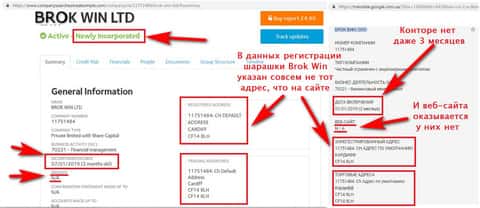 Если посмотреть информацию по номеру компании Брок Вин, увидим абсолютно другой адрес, чем тот, который указан на сайте. Оказывается, зарегистрированы мошенники не в Лондоне, а в Уэльсе: Cardiff, CF148LH. Не меньше настораживает и очень небольшое время существования компании – всего чуть более 2 месяцев.