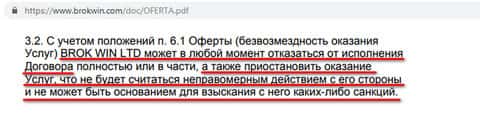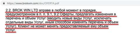 Оферта, которую наивный клиент заключает с шайкой мошенников Брок Вин, уже с самого начала настораживает пунктом о том, что Brokwin имеет право в любой момент как угодно изменить услуги, предоставляемые второй стороне – исключить отдельные услуги, изменить перечень или объем услуг. Клиент же не может менять то, что ему предлагают лохотронщики.