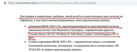 В клиентском соглашении указан третий юридический адрес шараги Брок Вин, который, как оказалось, используется преступниками, поддельными организациями, скрывающими свои истинные контакты. Помните, что вкладывая деньги в Brokwin, вы доверяете их жуликам. Как только ваши денежки утекут в их карман, вы не сможете достать их никаким образом.
