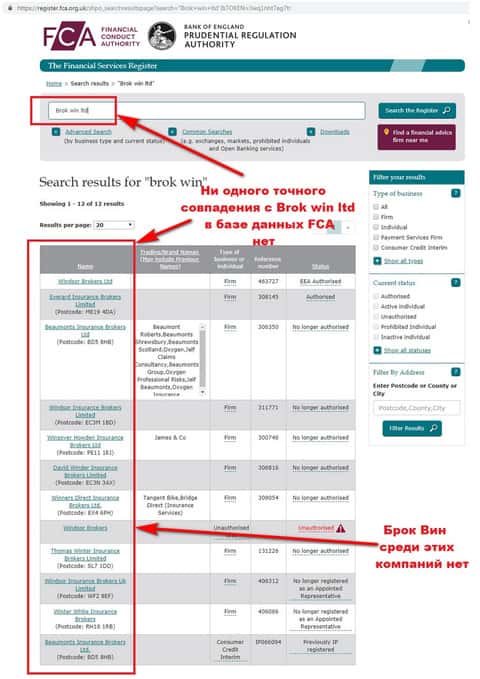 Поскольку контора Брок Вин заявляет о том, что находится в Лондоне, у нее обязательно должно быть разрешение от официального Великобританского регулятора форекс-брокеров – FCA. Только в этом случае компании можно доверить свои деньги и не бояться за кидалово. Жулики не учли, что сейчас легко можно проверить информацию на портале FCA. Конечно же, их в базе нет.