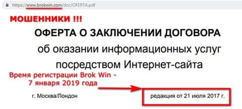 Также не ясно, как может стоять в оферте Brokwin дата редакции от 21 июля 2017 года, если шарашка зарегистрирована официально лишь 2 с небольшим месяцев назад. По всей видимости, мошенники просто действовали под другим именем, и после очередного крупного кидалова были вынуждены сменить «явки и пароли». При этом они даже не удосужились проверить документы.