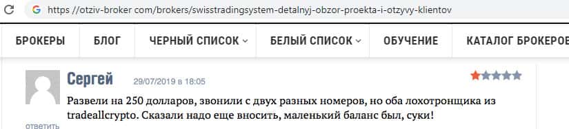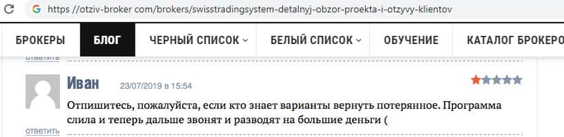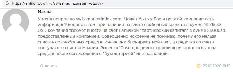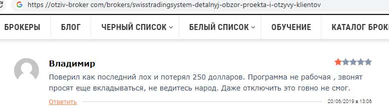 - Негативный отзыв от клиента в сторону обманщиков из шарашкиной организации SwissTradingSystem Com