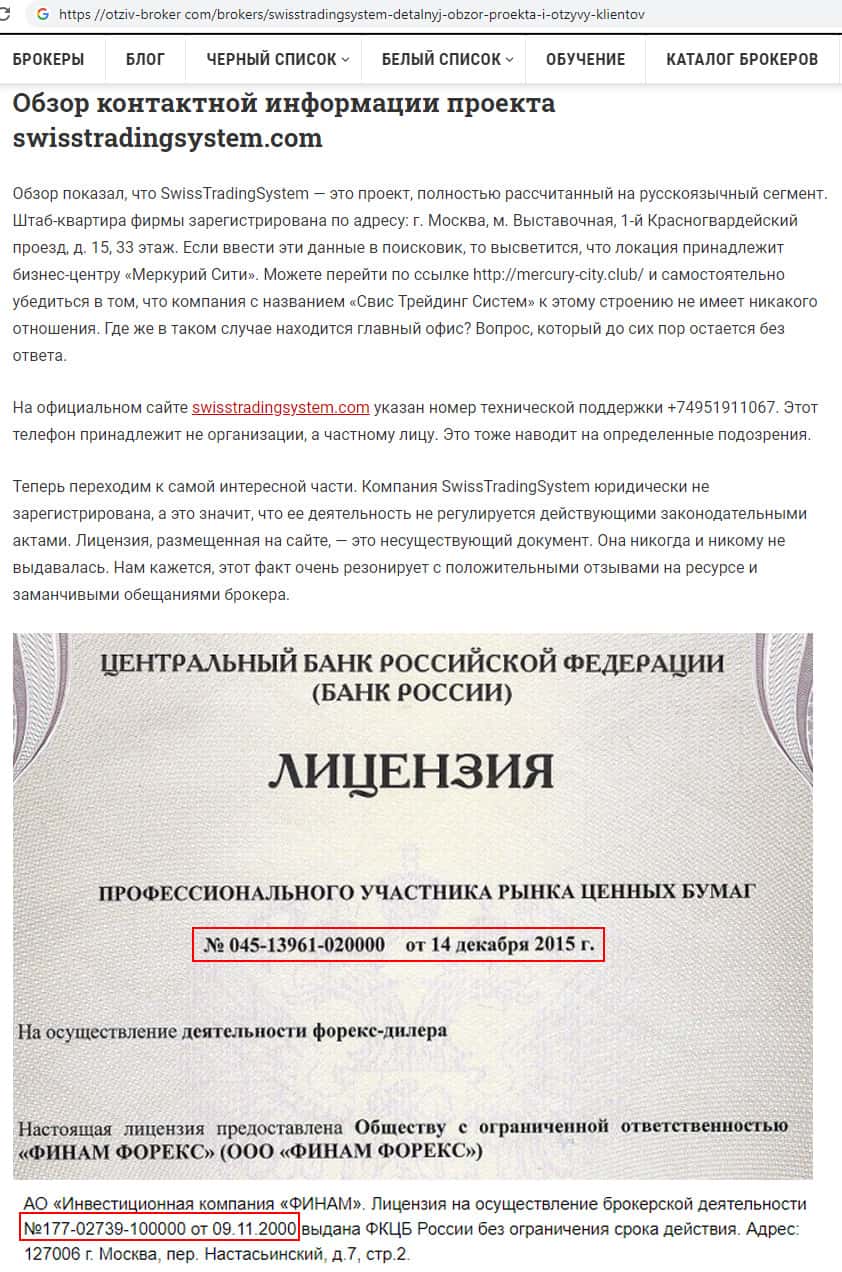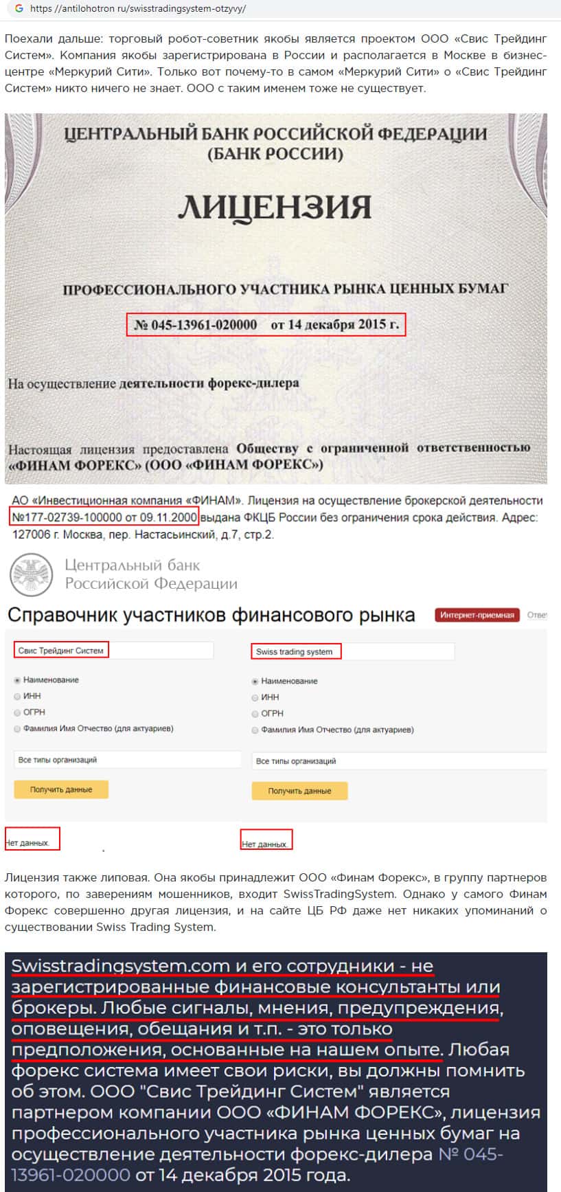 Далее говорится о том, что сведения о наличии лицензии на оказание брокерских услуг на официальном ресурсе плутовского дилера SwissTradingSystem Com - несусветная ложь. На сайте Центрального банка РФ нет ни единого упоминания о вышеуказанном форекс брокере и тем более о его лицензировании. Очередная махинация и вранье на лицо.