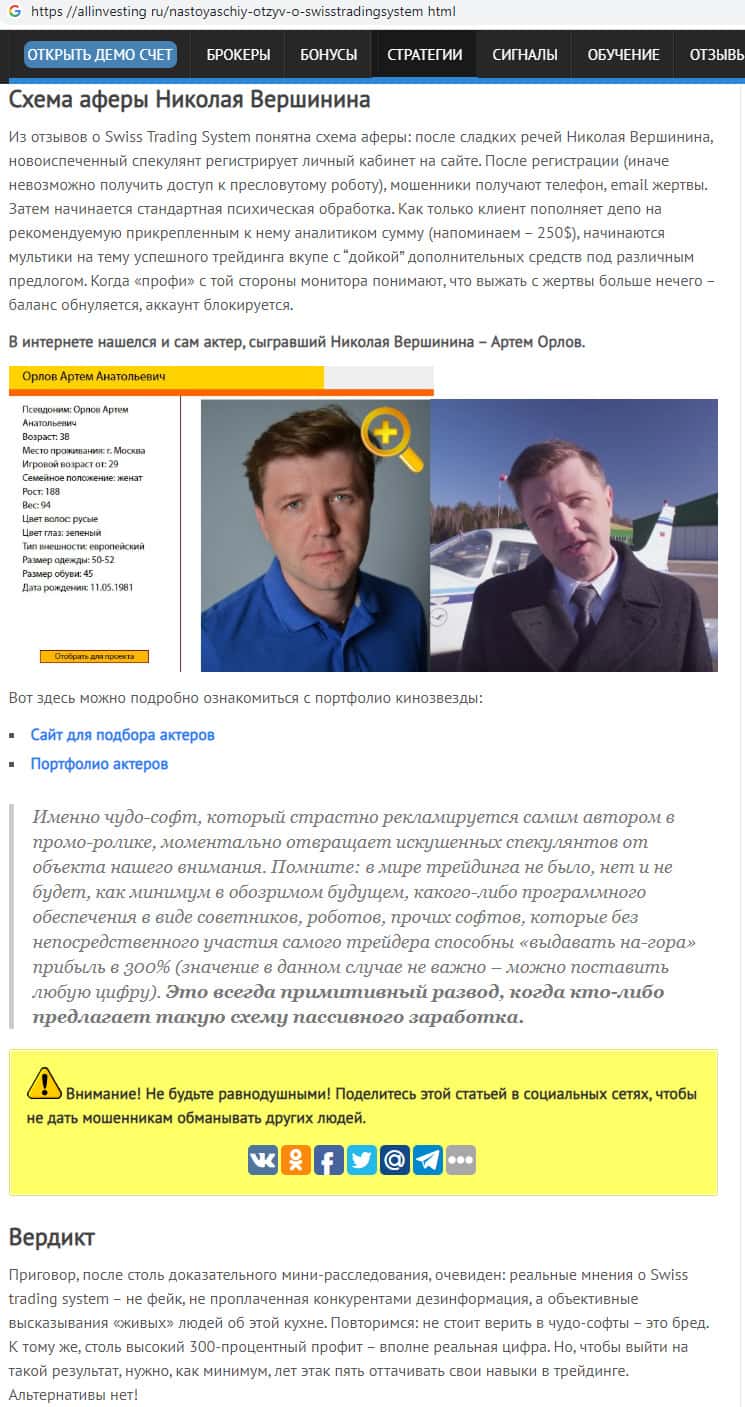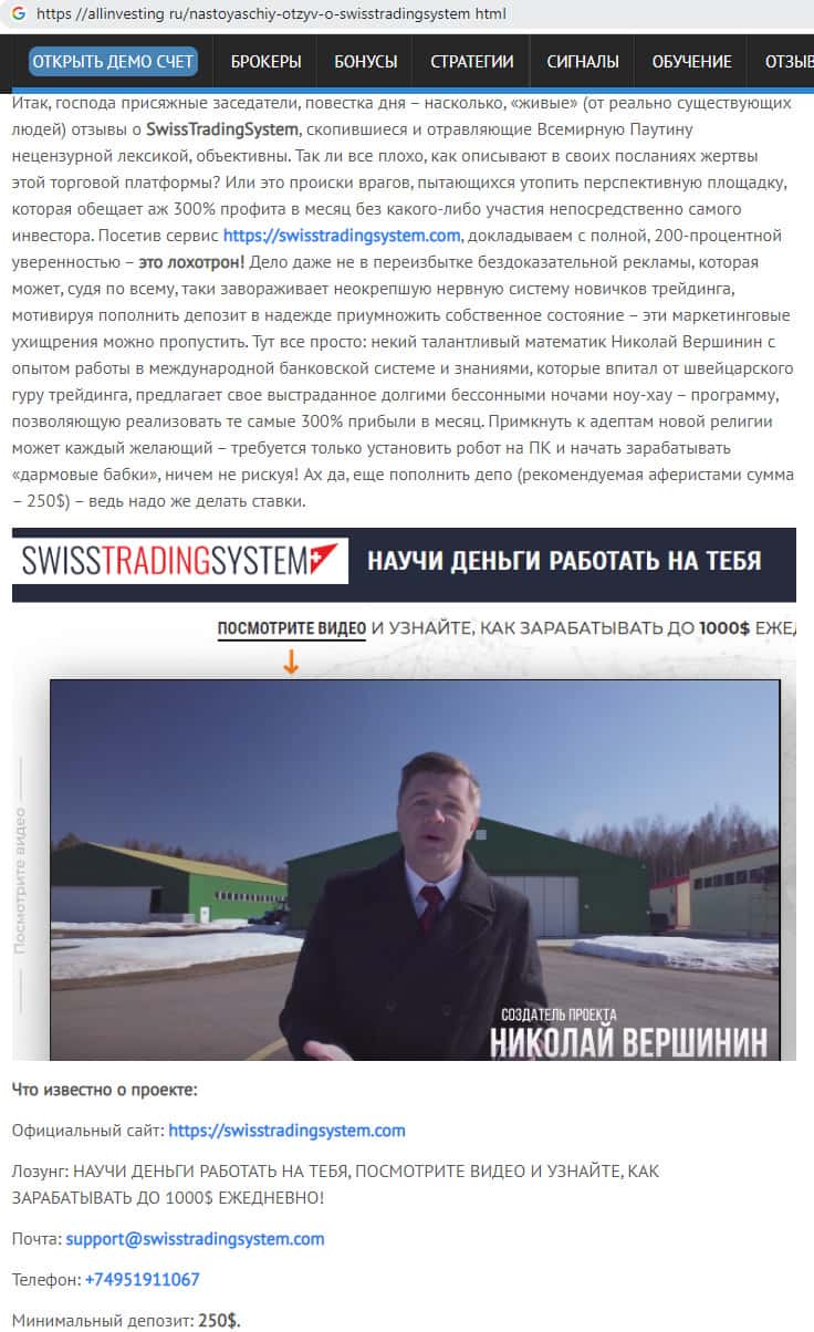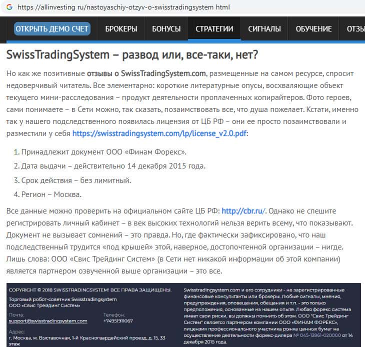 - Мнение известного портала allinvesting ru о липовой брокерской организации SwissTradingSystem Com