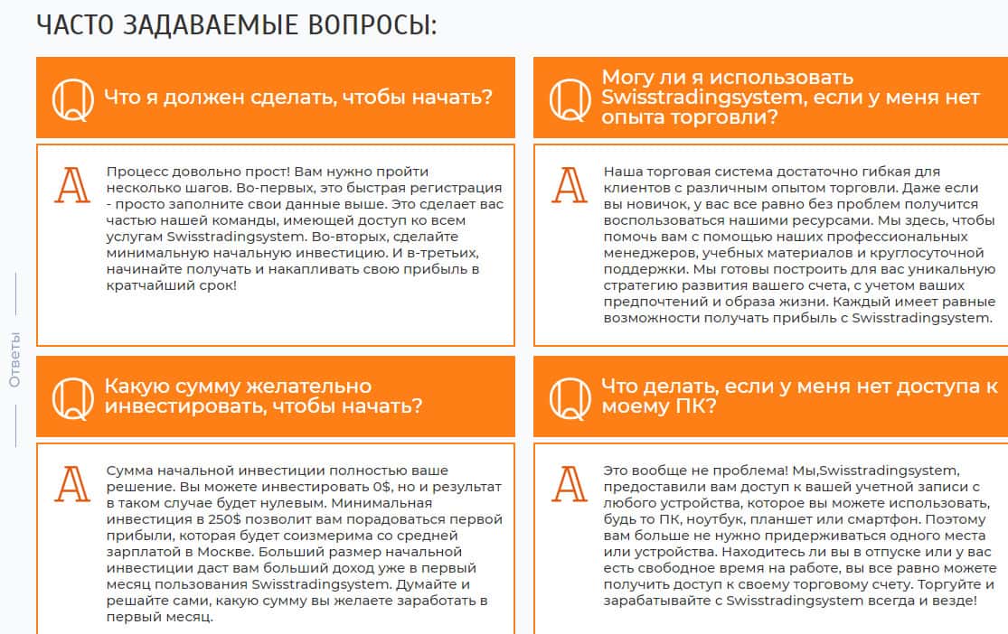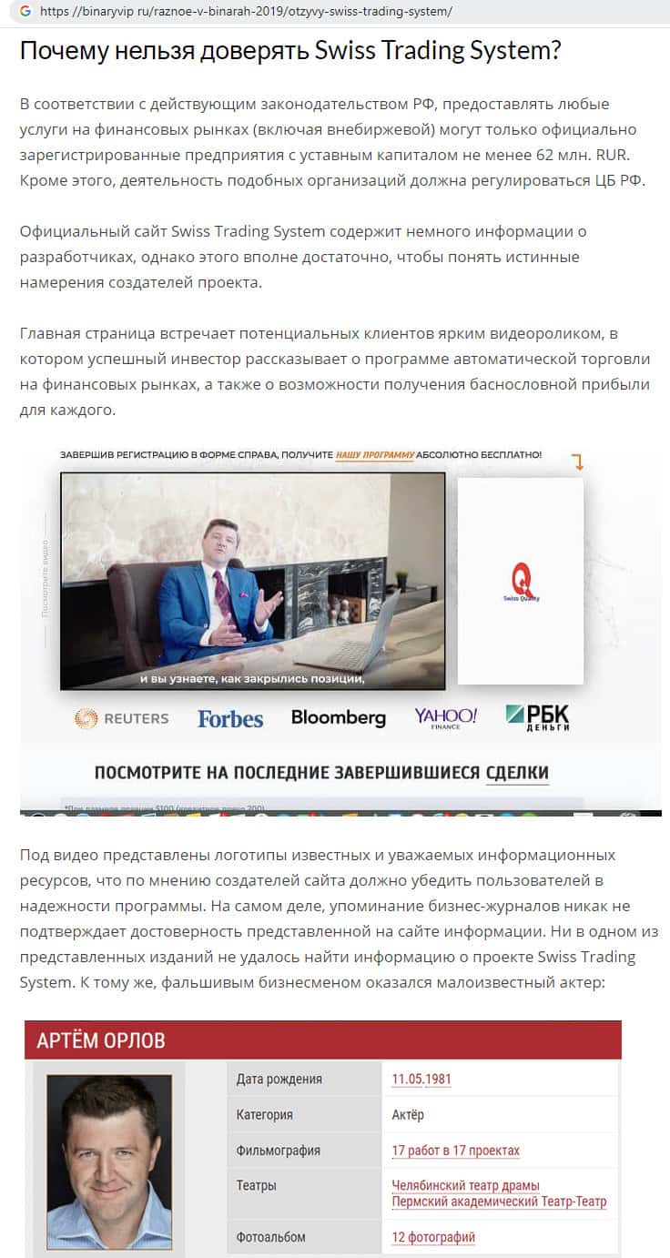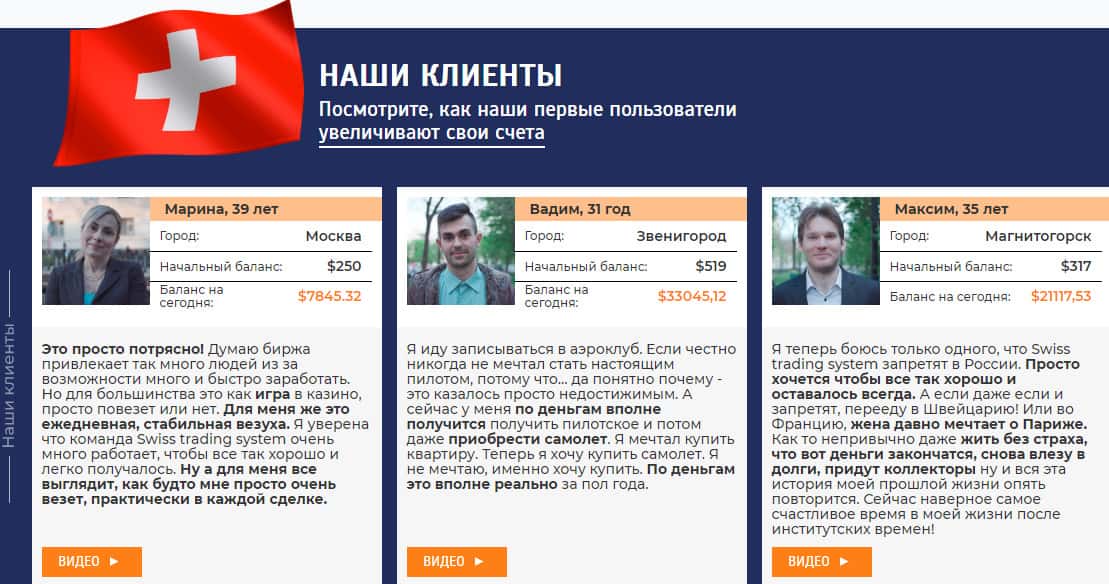 Начинается обзор на авантюрную брокерскую компанию SwissTradingSystem Com с того, что сообщают о главной странице, встречающей вкладчиков ярким видеороликом, в котором успешный инвестор рассказывает о программе автоматической торговли на финансовых рынках и обещании нереальной прибыли. На самом деле, это обычный актер, которому заплатили.
