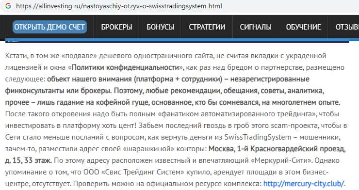 Мнение известного портала allinvesting ru о липовой брокерской организации SwissTradingSystem Com