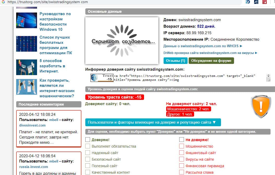 Также нам стало интересно касательно данных о домене лживого форекс дилера SwissTradingSystem Com. На самом деле брокер приобрел себе домен, которому уже около двух лет, чтобы казаться более зрелым. Также есть моменты, что уровень траста в минусовом значении, а не доверяют сайту как минимум 2 человека.