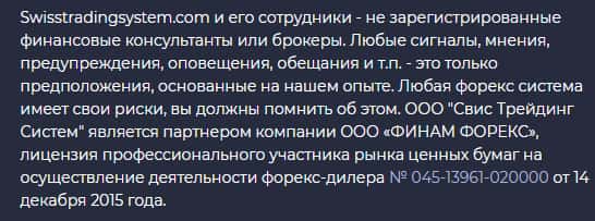 В следующей части обзора говорится о том, что согласно информации, предоставленной самими ворюгами SwissTradingSystem Com на их официальном интернет-сервисе, менеджеры проекта не являются финансовыми консультантами или брокерами. В общем, бабки хапать от своих клиентов хотят, а нести ответственность и убытки - нет.