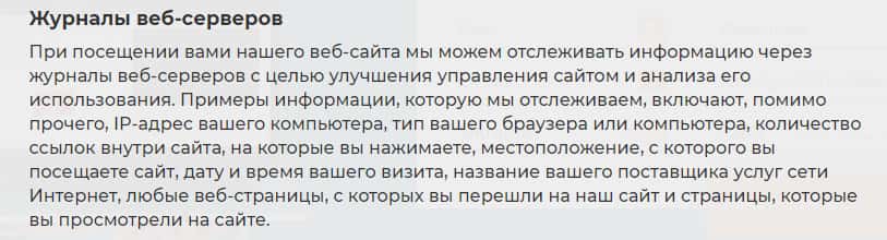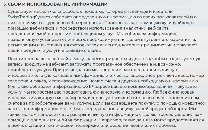 В следующем разделе политики конфиденциальности "Журналы веб-сервисов" черным по-белому написано, что аферисты из шараги SwissTradingSystem Com вправе с целью улучшения управления сайтом и анализа его использования отслеживать IP-адрес компьютера, тип Вашего браузера или компьютера. Это, как минимум, незаконно.
