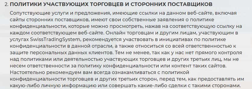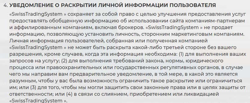 Далее говорится о том, что сотрудники мошеннического брокера SwissTradingSystem Com не являются финансовыми консультантами либо брокерами, а все их мнения и обещания – это только предположения. Тогда вопрос один: как можно пользоваться услугами компании, которая не имеет на это никаких законных оснований и брокерского профессионализма.