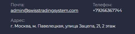 Для всех потенциальных биржевых игроков, которые желают собственноручно пополнить карманы средствами проходимцев из авантюрной компании SwissTradingSystem Com, они предоставили свои контакты в виде адреса, номера телефона и электронной почты. Но не вариант, что Вам вообще мошенники из этой псевдоорганизации ответят. Контакты аферистов: