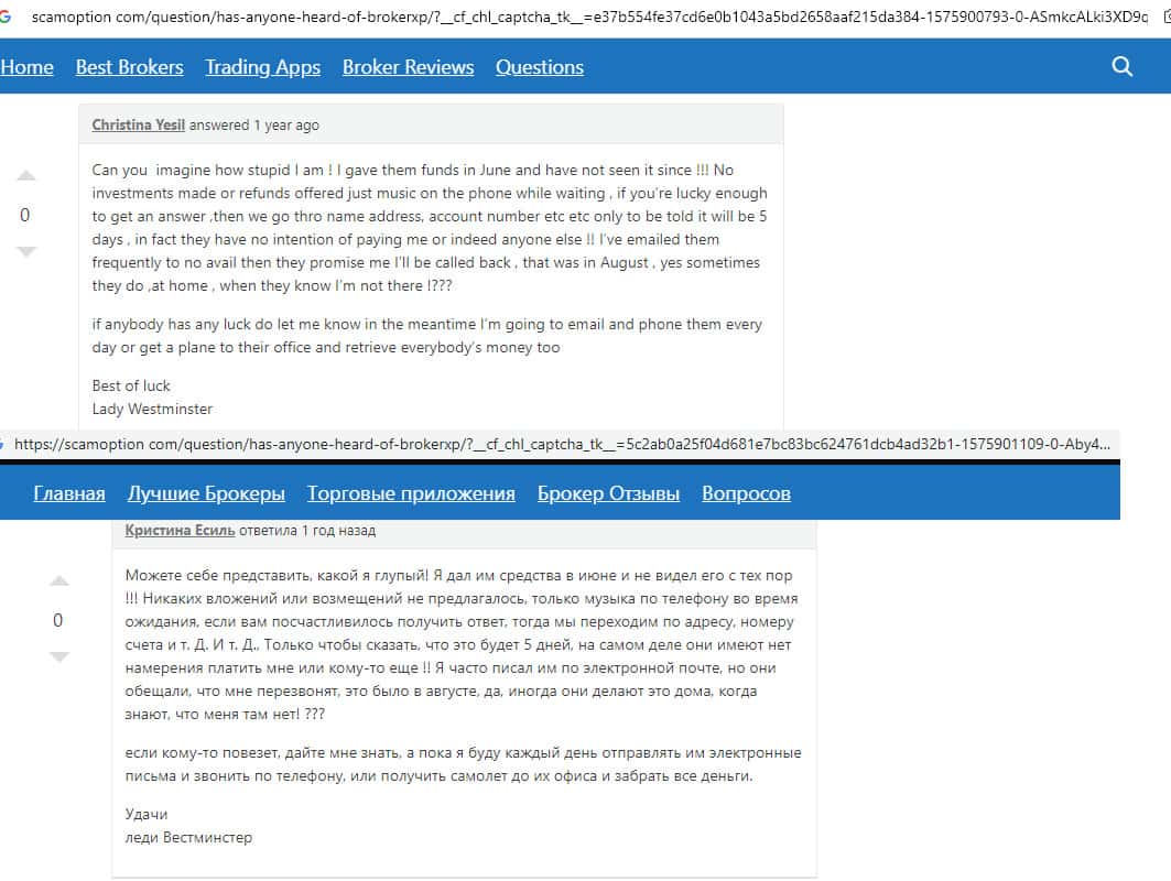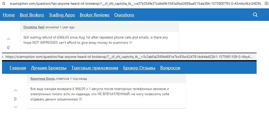 Женщина рассказывает в отзыве, как она ожидает возврата средств в размере 1000 фунтов стерлингов из мошеннической конторы BrokerXP. Аферисты использовали ее наивность и смогли вытащить все сбережения. Они продолжают названивать своей жертве и требовать повторных вложений.