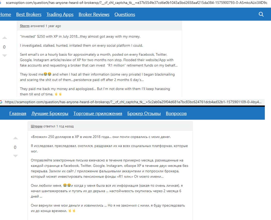 Человек вложил в контору BrokerXP порядка 250 долларов и теперь отказываются их возвращать. Но у клиента есть определенная информация, которая может разоблачить всю их шулерскую схему. Таким образом, он стал их шантажировать и будет делать это до тех пор, пока они не вернут ему украденное.