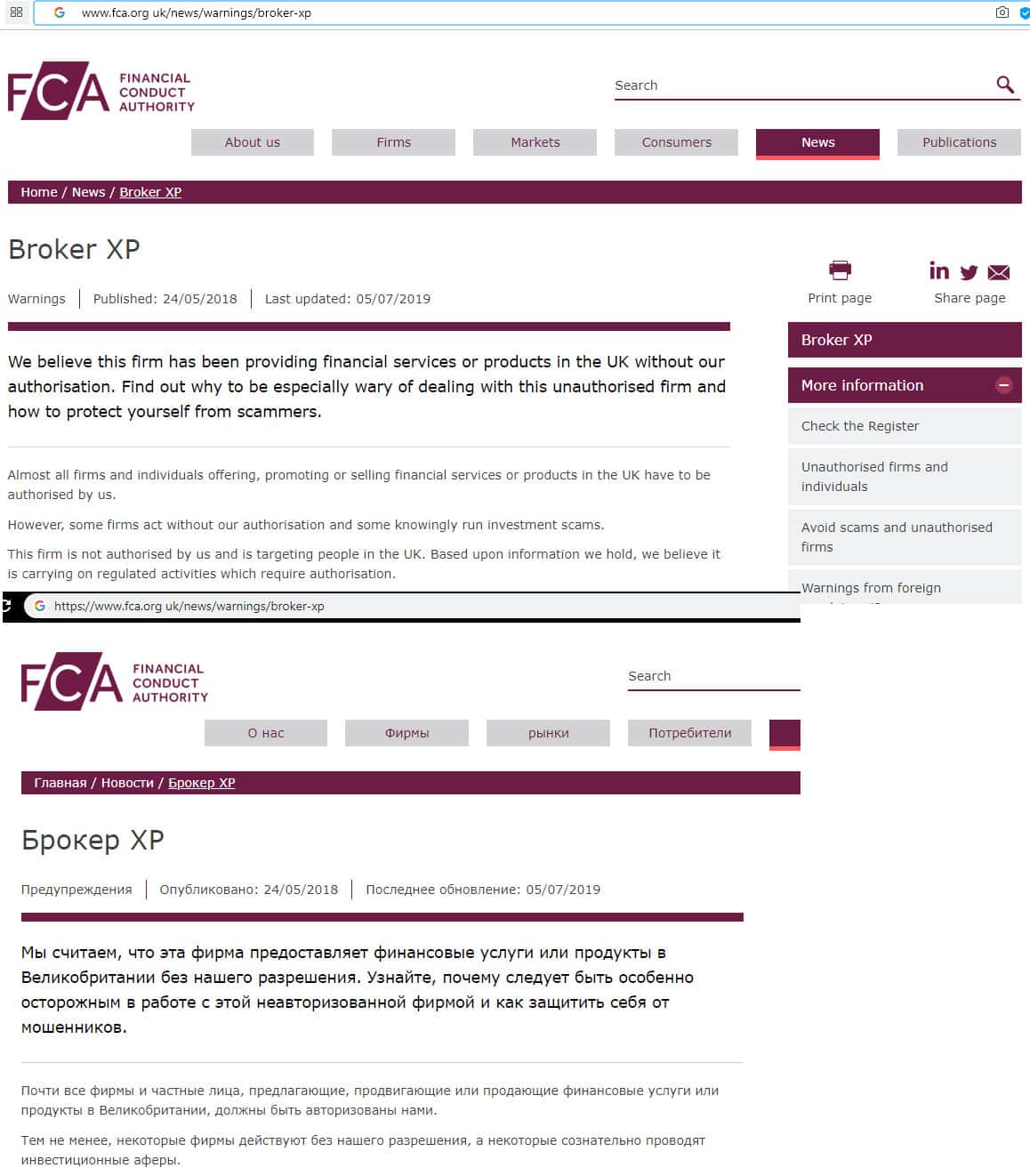 И такие домыслы не спроста, так как сам регулятор из Великобритании FCA, уведомляет всех клиентов конторы BrokerXP, что данная организация предоставляет финансовые услуги или продукты без их разрешения. Поэтому деятельность лохотрона Брокер ХР можно теперь точно считать откровенно мошеннической.