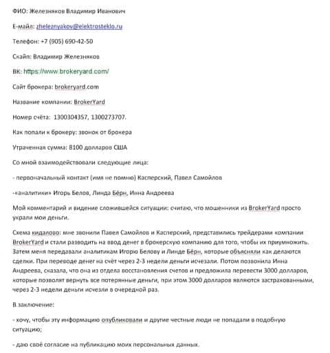 Жалоба на шулеров BrokerYard от очередного обманутого трейдера