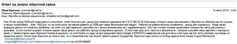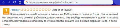 С иностранными трейдерами у шулеров Брокер Ярд разговор тоже короткий - после вноса большой суммы денег на счет шулеров BrokerYard, аферисты просто в ноль сливают счет клиентам и даже не особо пытаются оправдываться, а просто игнорируют жертву. На изображении ниже вы можете увидеть очередной негативный отзыв в сторону аферистов Брокер Ярд.