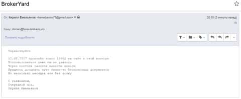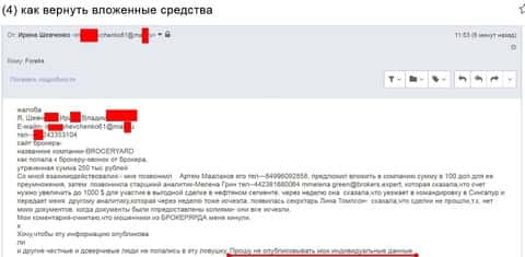 Очередной пострадавший отправил запрос на оказание содействия в возврате украденных средств из Брокер Ярд. Утраченная сумма составила 250 тысяч рублей.