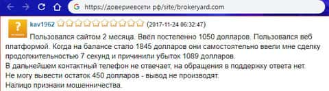 На изображении ниже вы можете увидеть очередной негативный отзыв от облапошенного трейдера в сторону шулеров Брокер Ярд, которые развели его на тысячу долларов, после чего по своей, уже проверенной, схеме слили ему счет. После данной выходки аферисты BrokerYard перестали реагировать на сообщения обманутого клиента и не дают вывести ему остаток.