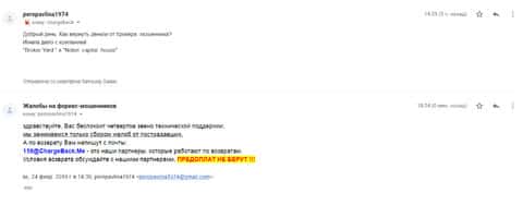 На изображении ниже вы можете увидеть реальный отзыв клиентки, обманутой жуликами NobleCapitalHouse, которые работали на пару с шулерами Брокер Ярд. В результате данного сотрудничества аферисты кинули клиентку на деньги и слились. В данной ситуации ресурс форекс-брокерс про советует обратиться в сервис ChargeBack.Me для возврата средств.