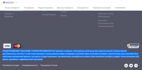Завершает данное подвальное чудо мошеннического промысла в исполнении аферистов BrokerYard меню сайта, иконки с неработающими ссылками на социальные сети и предупреждение о рисках, в котором шулера Брокер Ярд понятным языком отказываются от ответственности и предупреждают клиентов о возможных потерях вложенных жертвами средств.