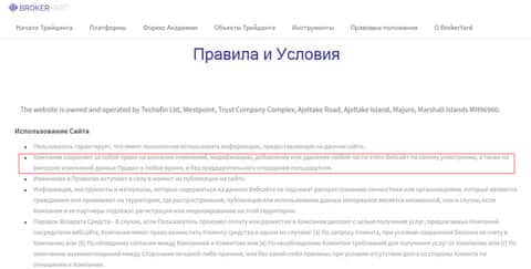 Условия сотрудничества у шулеров Брокер Ярд начинаются с короткого перечня условий, которые содержат в себе ряд кратких пунктов о сотрудничестве с жуликами BrokerYard. Одним из таких является условие о том, что мошенники Брокер Ярд могут в любой момент изменять данную политику. На изображении ниже вы можете увидеть начальные условия аферистов.