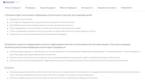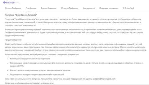 Политика конфиденциальности у мошенников Брокер Ярд, подобно правилам и условиям, представлена в отдельном разделе, но по своим размеру меньше и особо ничего толкового из себя не представляет, так как наполнена "водой" о личных данных клиентов. На изображении ниже вы можете увидеть внешний вид политики конфиденциальности шулеров BrokerYard.