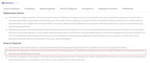 Далее жулики Брокер Ярд в своих условиях сотрудничества вообще заявляют о том, что не несут никакой ответственности за качество предоставляемой ими информации, тем самым жулики разводят клиентов сразу по двум направлениям, а именно с точки зрения брокера, ведь аферисты могут крутить котировки в любые стороны и в моменте доверительного управления.