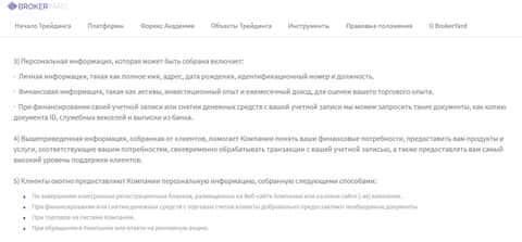 Далее в политике конфиденциальности аферистов BrokerYard идут разделы с более детальным описанием и количеством личной и персональной информации, запрашиваемой лохотроном Брокер Ярд при так называемой верификации клиента. На изображении ниже вы можете увидеть данный перечень собираемых мошенниками BrokerYard данных их клиентов.